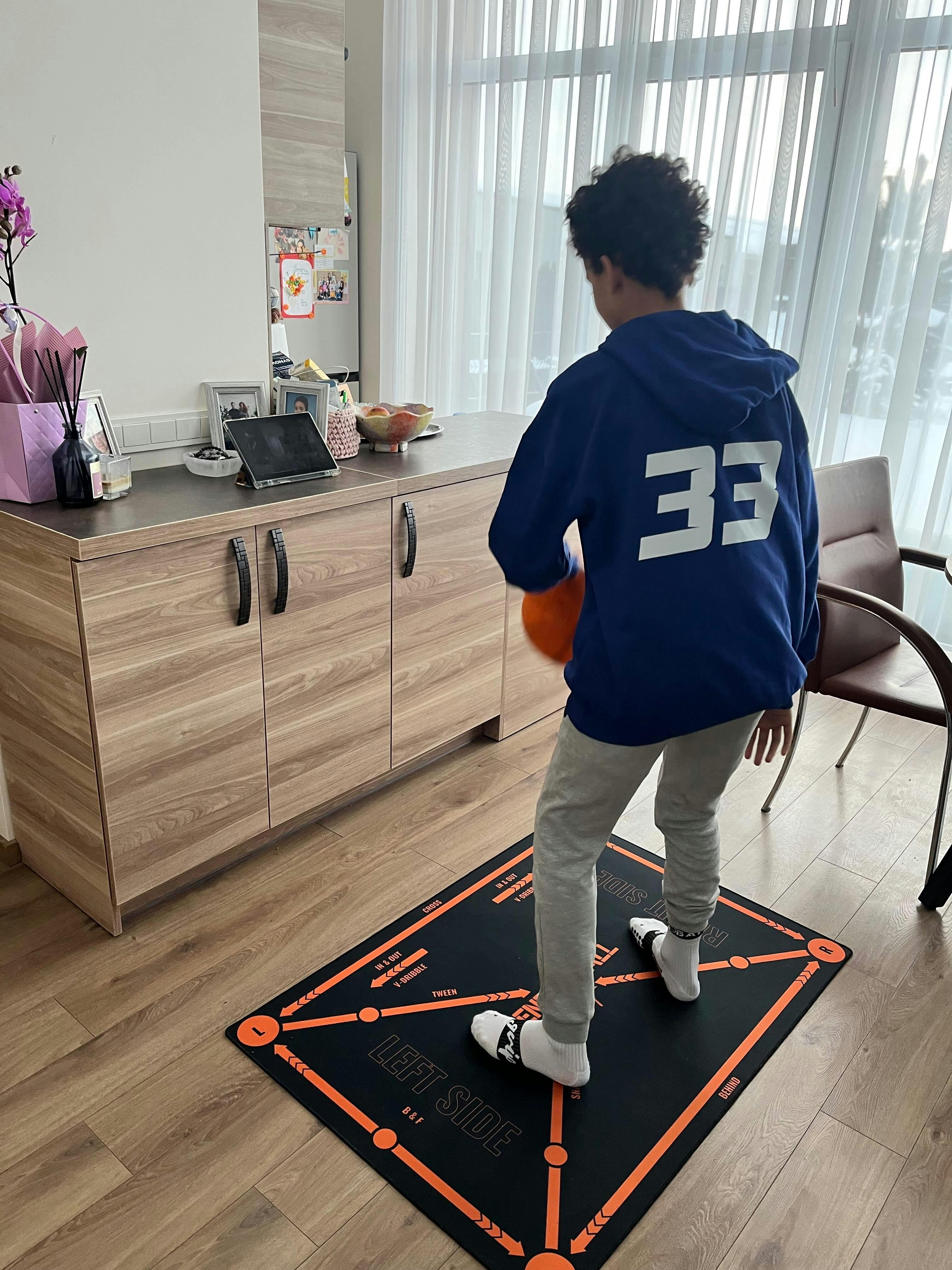 You only need a small area - about 1.5 x 1 meters of open space is enough for your child to train comfortably. The Training Mat is compact and fits perfectly in living rooms, bedrooms. Your child can complete every drill safely indoors without worrying about space, noise, or damage - the SilentBall makes training completely quiet and home-friendly.
